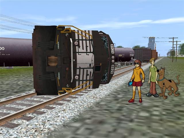 “I see your point,” Dave said, “but I’m not going to totally rule out my other theory.” He reached for his cell phone and called his “official co-investigator,” Kathy Millens, an agent assigned to the FBI’s Springfield field office. Millens told Dave that she had finished interviewing John and Wendell, and was heading over to Rico to interview the management of the Casa de Salsa club. When the conversation was finished, Velma asked to borrow Dave’s cell phone to call Daphne. Though against protocol, Dave was agreeable to the request. Daphne informed Velma about Ricky Barretto’s supposed “alibi.” Daphne then asked Velma if there was any possibility that Cosmo was involved in causing the wreck. Velma said Cosmo couldn’t have possibly done this; he had taken a group of his students to Costa Rica two weeks prior on an archeological dig, and that they would be spending most of the summer there. Cross off one suspect. Dave then called Kathy again and told her that upon interviewing Barretto, if she felt it was necessary to, have him taken into custody and held as a “material witness.” Finally after some walking, the group reached the wreck scene. It was a tangled mess of metal, twisted rails, splintered ties, and other debris. The area reeked of diesel fuel. While most of the spilled soybeans from the grain cars had been cleaned up, enough of them remained to make the ground slippery. Velma slipped on the round kernels twice, Dave catching her both times. They then came to the crumbled remains of engine #8929. It was lying on its side, its nose was bashed in, and the windshield was shattered. It was through this opening that emergency workers pulled John and Wendell from the smashed remains of their cab. “I’m surprised anyone survived in there,” Dave commented. Velma looked at the carnage and uttered, “Jinkies!” Shaggy had a similar reaction as he looked at the twisted mess and exclaimed, “Zoinks!”